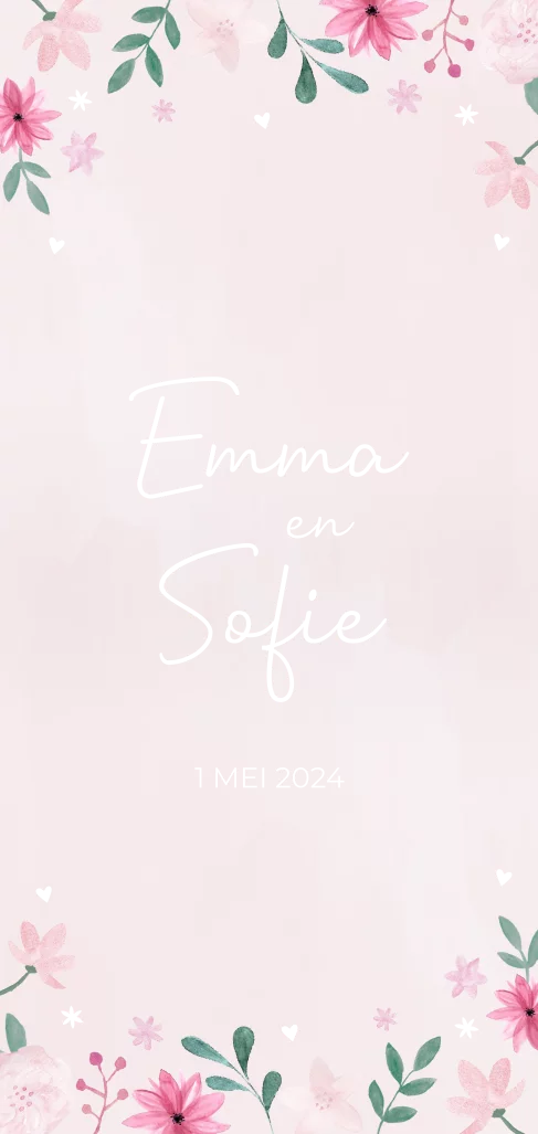 Op zoek naar een echt meisjeskaartje voor een tweeling? Dan is dit lieve romantische geboortekaartje met roze bloemen vast een match! De naam en kleine details van hartjes en bloemetjes zijn in goudfolie. De kleur van de folie kun je naar wens aanpassen.