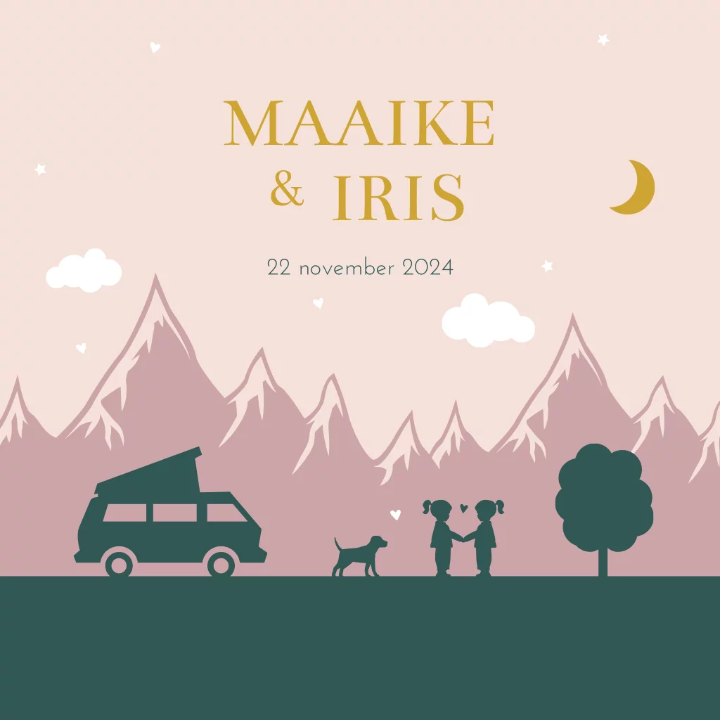 Een avontuurlijk geboortekaartje voor twee meisjes! Houden jullie van reizen? Dan past dit kaartje helemaal bij jullie toekomstige avontuur! Het geboortekaartje heeft roze tinten met bergen, een sterrenhemel, een camper en twee meisjes. Pas de kaart nog naar wens aan in de editor.