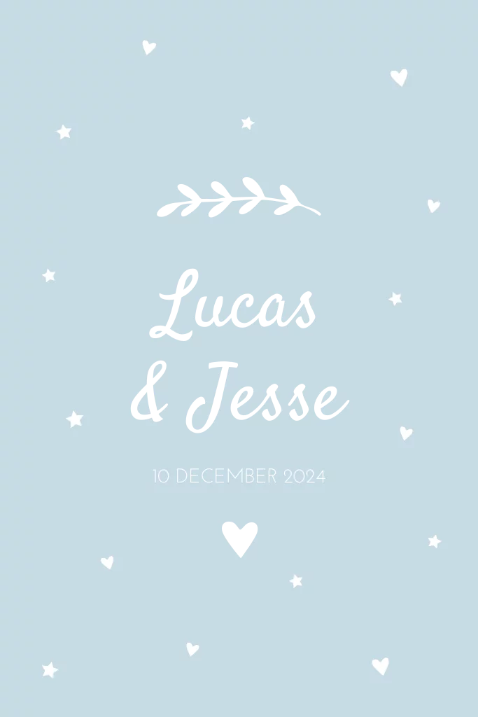 Lichtblauw geboortekaartje voor een tweeling met goudfolie, sterren en hartjes. De kleur van de kaart en de folie kun je naar wens aanpassen.