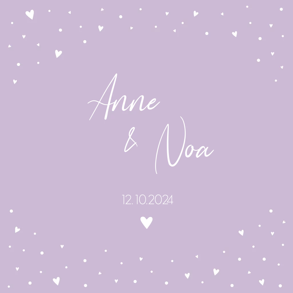 Een modern geboortekaartje voor een meisjes tweeling in een trend kleur: lila! Het geboortekaartje heeft een rand van hartjes en is afgewerkt met rosefolie. Aan de binnenzijde is plaats voor alle tekst en een mooi gedichtje. Pas de kleuren en de folie nog naar wens aan.