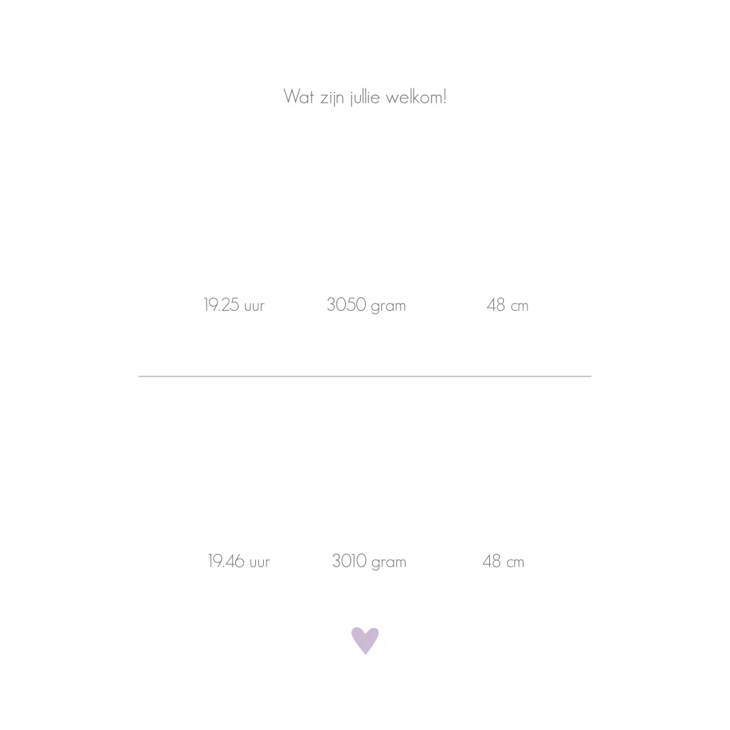Geboortekaartje tweeling meisjes modern hartjes lila rosefolie
