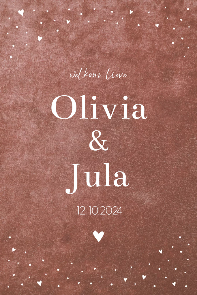 Een modern geboortekaartje voor een tweeling met hartjes en goudfolie. Het dubbel gevouwen kaartje heeft een warm rode velvet look achtergrond. Pas de kaart nog naar wens aan in de editor, zodat het kaartje helemaal persoonlijk wordt.