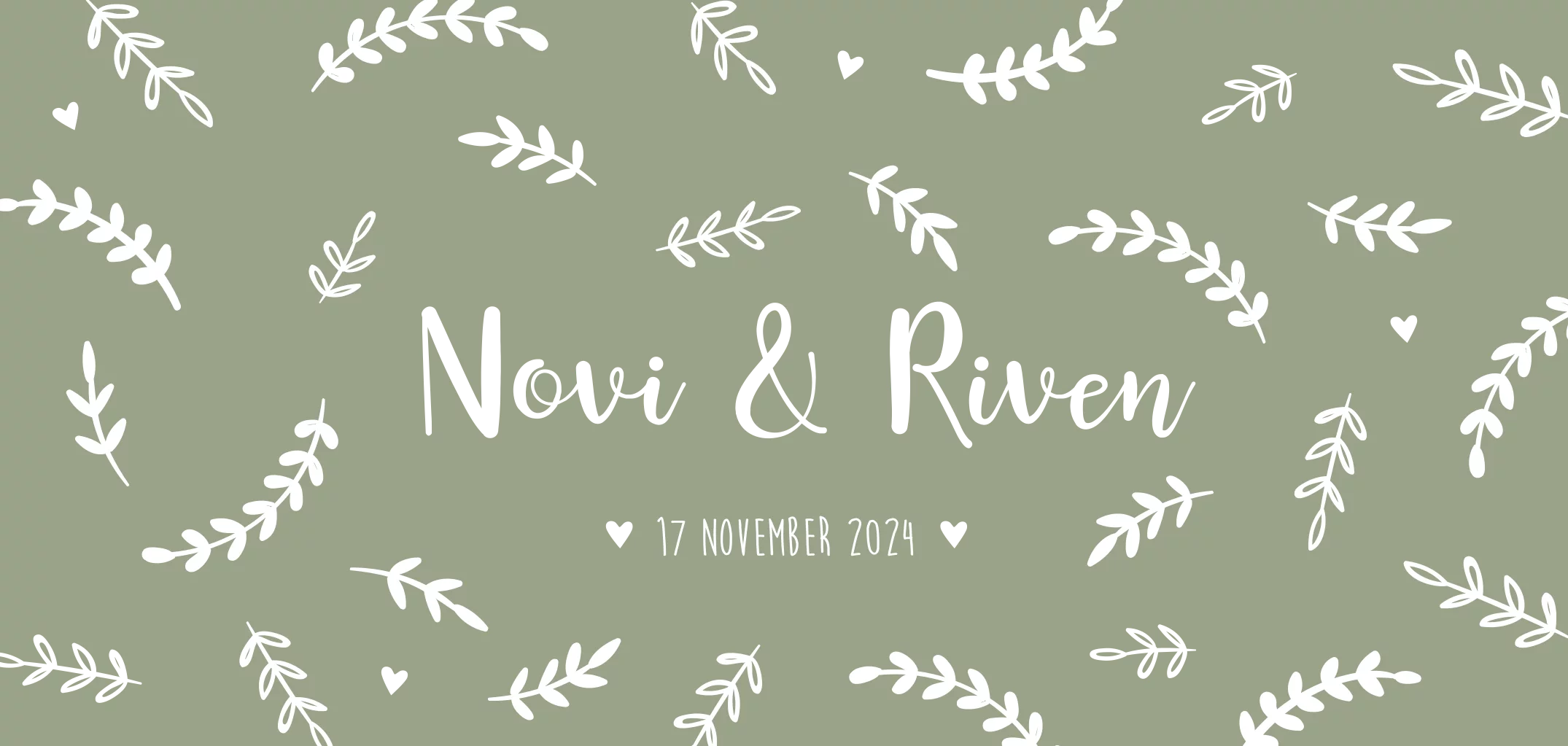 Botanisch geboortekaartje voor een tweeling met witte blaadjes en een olijfgroene achtergrond kleur. De namen en hartjes op de voorzijde in goudfolie. Pas de kleur van de kaart en de folie naar wens aan.