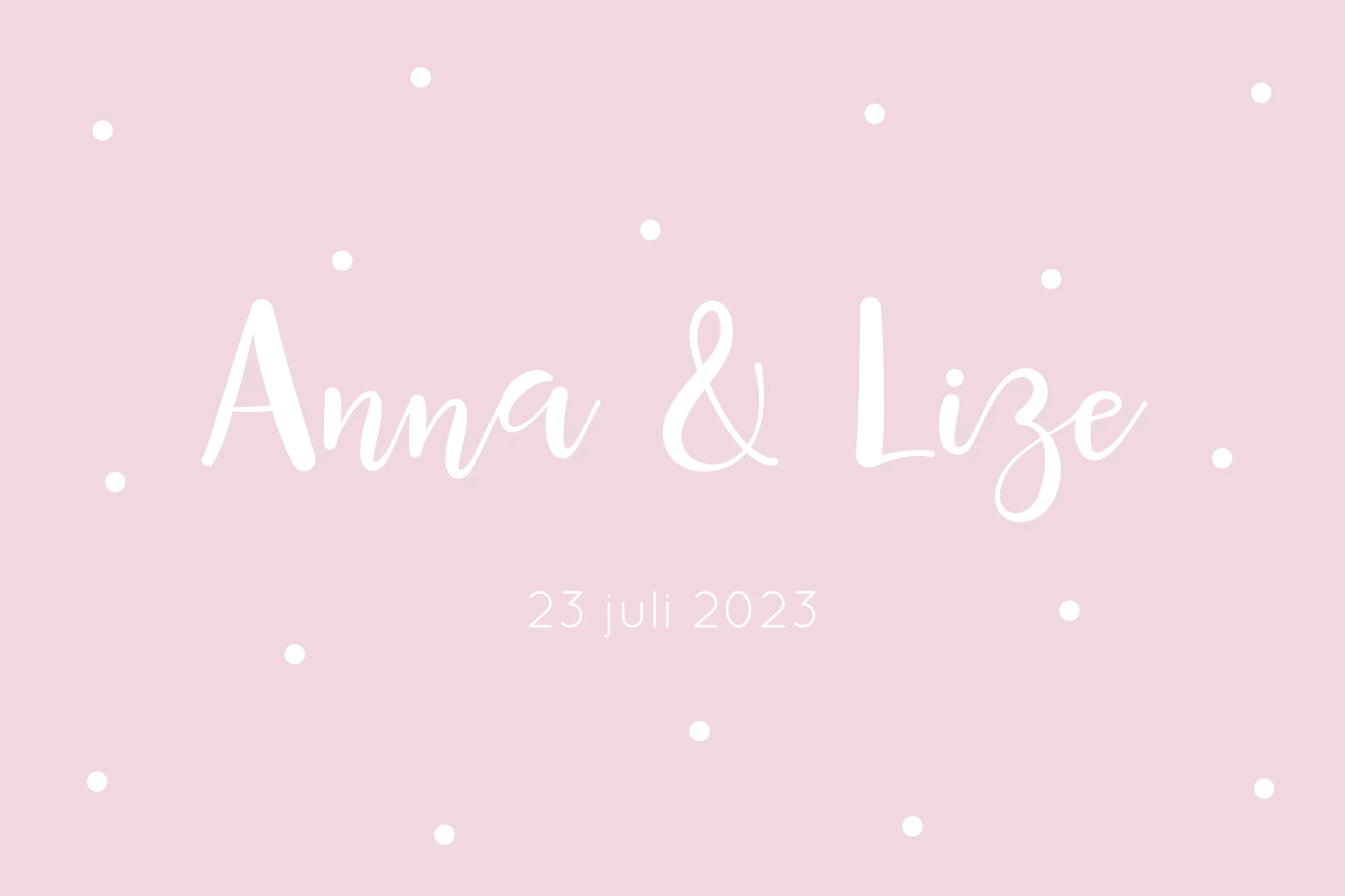 Lief geboortekaartje in de kleur pastelroze met goudfolie stippen voor een meisjes tweeling. De kleur van de kaart en de folie kun je naar wens aanpassen.