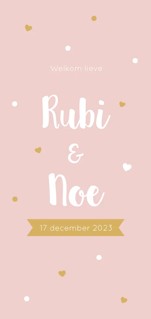 Roze met okergeel geboortekaartje voor een tweeling. Het kaartje heeft feestelijke confetti met hartjes. Op de achterzijde is voor beide kindjes plaats voor de geboortegegevens. Pas de kleur van de kaart naar wens aan.