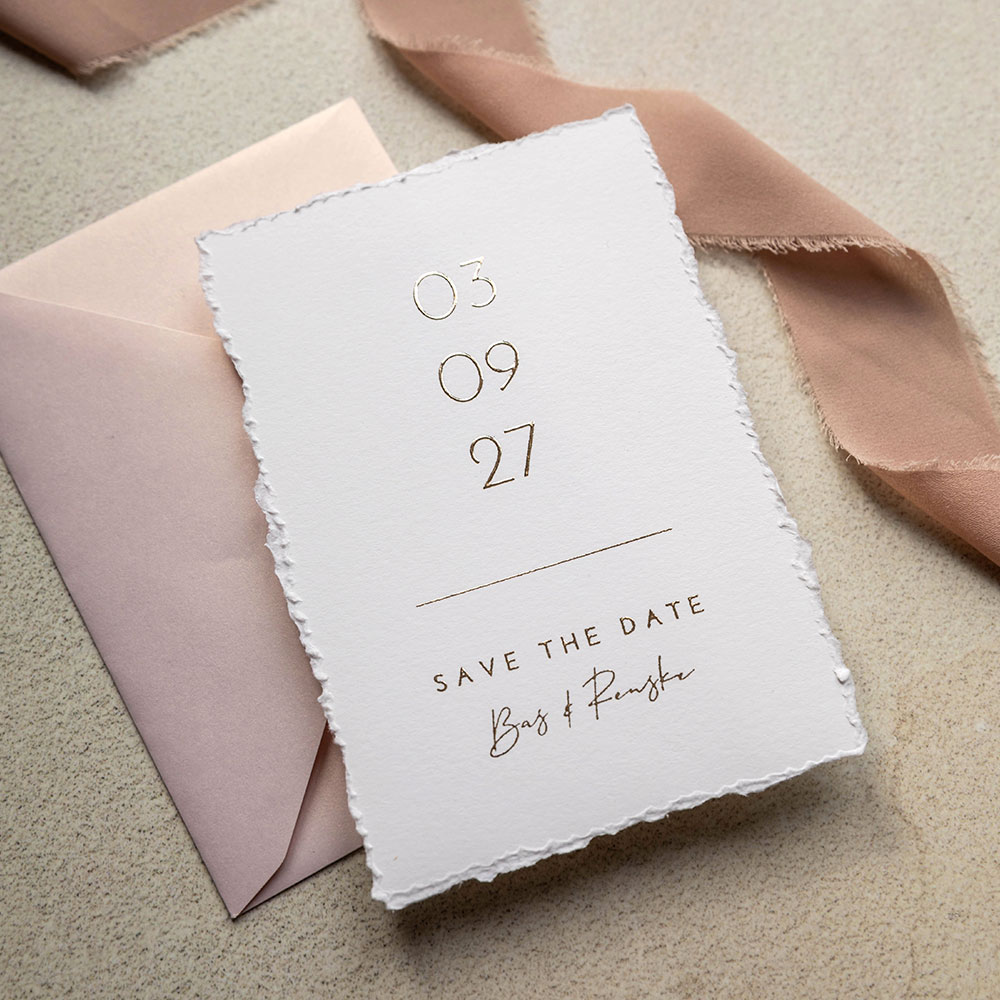 Ontwerp een prachtige save the date kaart met handgeschept look papier en goudfolie voor jullie bruiloft!