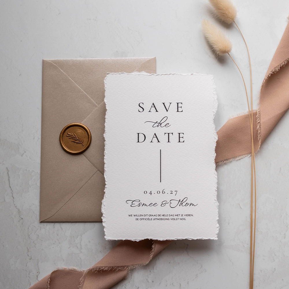 Wauw, dit is echt een unieke save the date voor jullie bruiloft! Een handgeschept papier look save the date in moderne stijl.