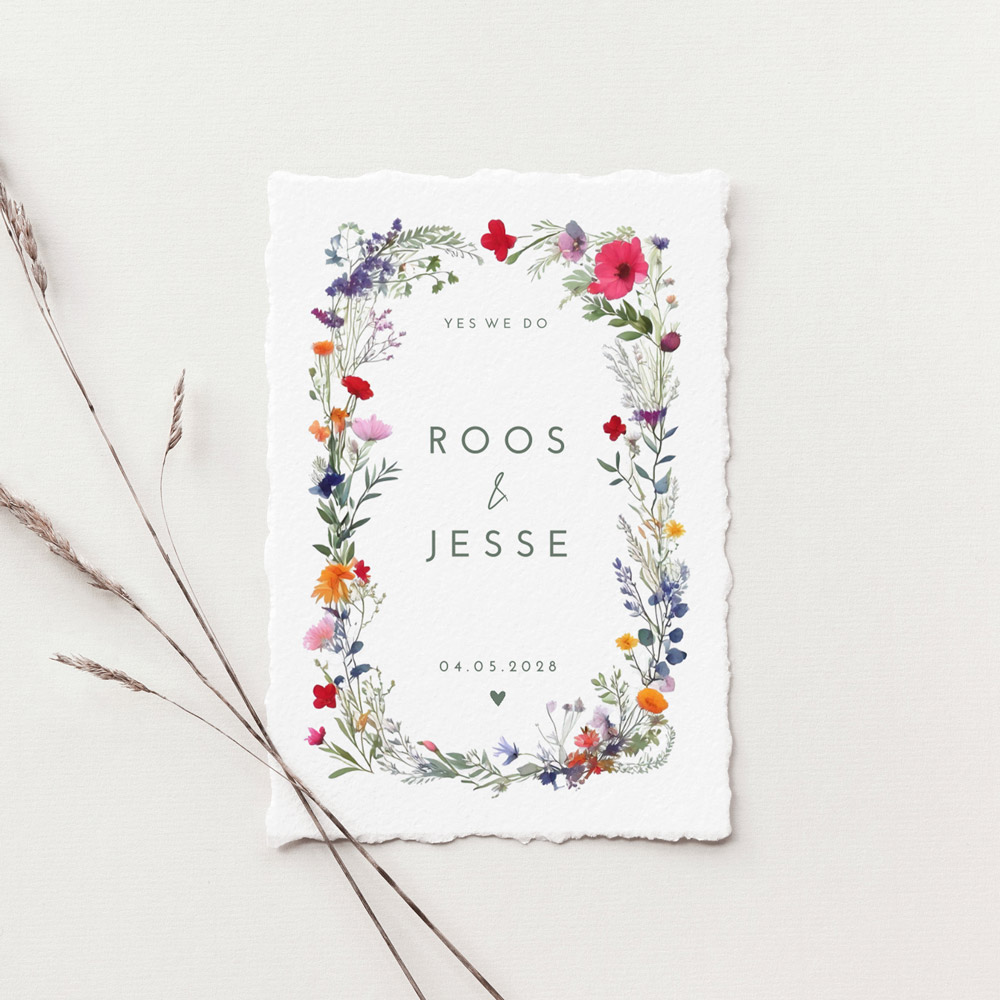 Op zoek naar een bijzondere trouwkaart voor jullie bruiloft? Dan past deze handgeschept papier look trouwkaart met krans van kleurrijke bloemen er perfect bij!