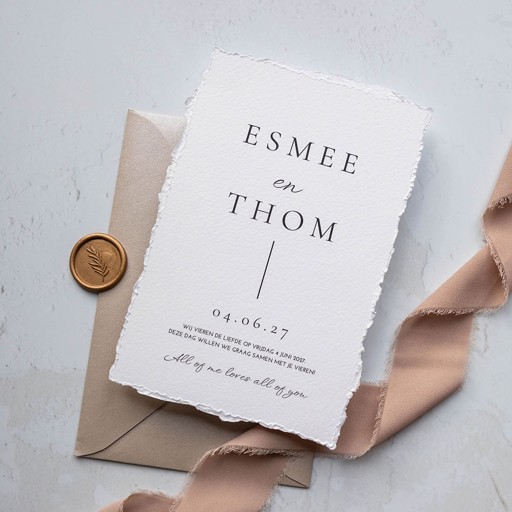 Op zoek naar een bijzondere trouwkaart voor jullie bruiloft? Dan past deze handgeschept papier look trouwkaart in klassieke stijl er perfect bij!