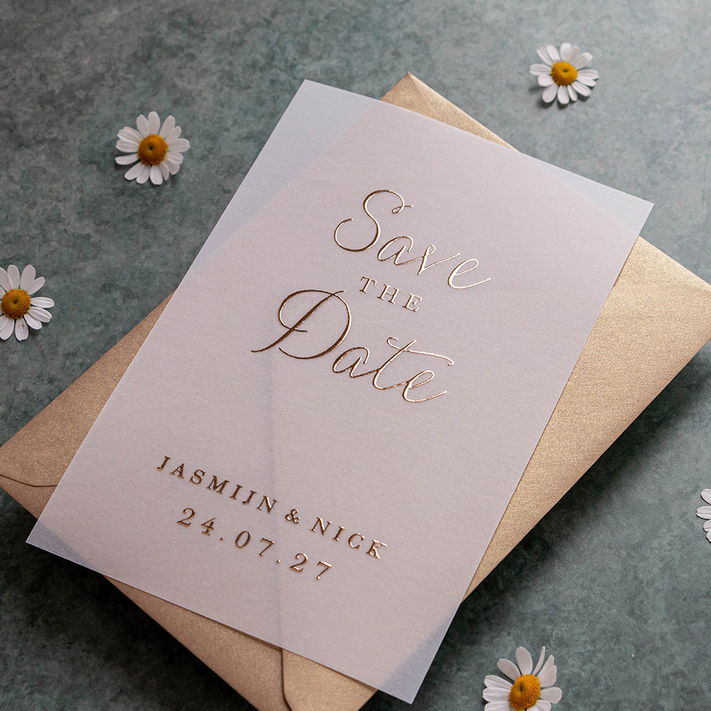 Stijlvolle save the date kaart met sierlijke letters in goudfolie. Deze save the date is gedrukt op transparant kalkpapier. Pas de kleuren en lettertypes nog naar wens aan in de stijl van jullie bruiloft.
