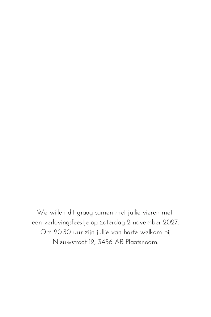 Unieke verlovingskaart op transparant kalkpapier! Dit doorschijnende papier geeft je kaart een mooi effect samen met de glimmende rosefolie. Met een verlovingskaart kunnen jullie de verloving aankondigen en een uitnodiging voor een verlovingsfeest geven.| Totaalprijs: 0 |