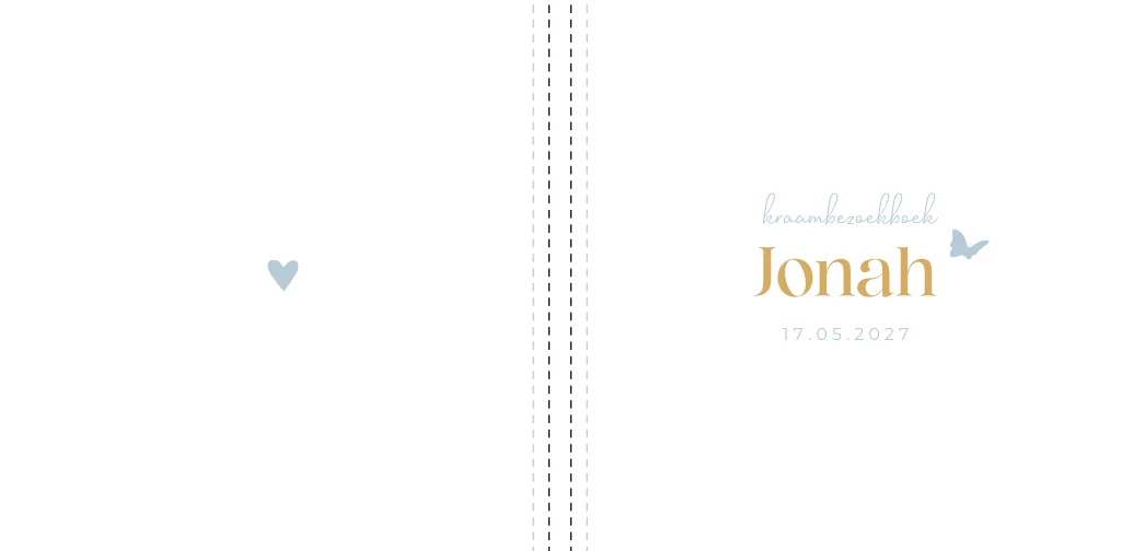 Dit kraambezoekboek voor een jongen is wit met goud en blauwe letters en een vlinder. Helemaal in de stijl van het geboortekaartje van Jonah. Pas de omslag naar wens aan in de editor. Het formaat van het boek is 25x25. Het boek heeft witte schutbladen aan de binnenkant en 30 bladen. Er zijn dus 60 pagina's om vol te schrijven door de kraamvisite.