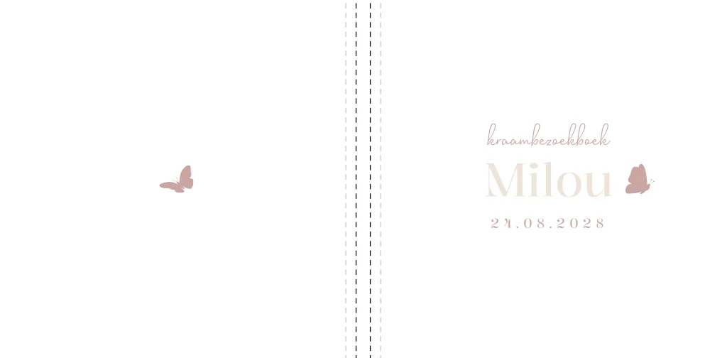 Dit kraambezoekboek voor een meisje heeft een witte achtergrond met roze vlinders in de stijl van het geboortekaartje van Milou. Liever een andere omslag? Je past het in de editor helemaal naar wens aan. Het kraambezoekboek is 25x25 cm en heeft witte schutbladen aan de binnenzijde. Met 30 bladen en dus 60 pagina's om te vullen is er genoeg plek voor het kraambezoek om een lieve boodschap achter te laten.