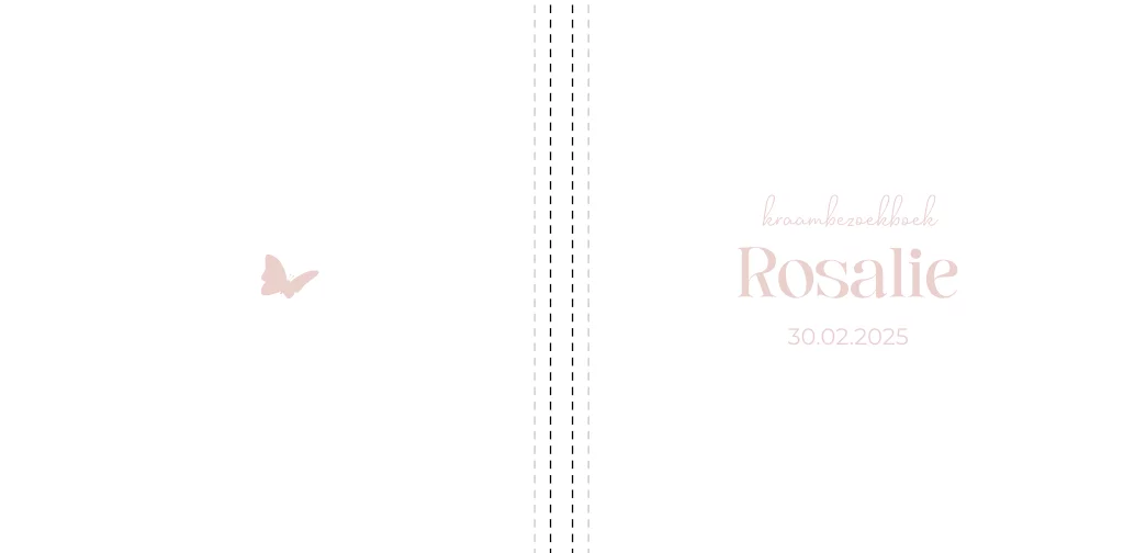 Dit kraambezoekboek voor een meisje heeft een witte achtergrond met roze lettertype en vlinder in de stijl van het geboortekaartje van Rosalie. Liever een andere omslag? Je past het in de editor helemaal naar wens aan. Het kraambezoekboek is 25x25 cm en heeft witte schutbladen aan de binnenzijde. Met 30 bladen en dus 60 pagina's om te vullen is er genoeg plek voor het kraambezoek om een lieve boodschap achter te laten.