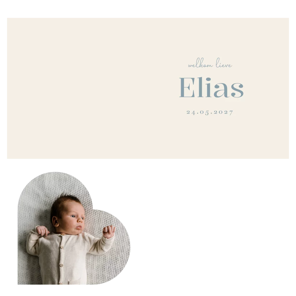 Een uniek geboortekaartje voor jullie kindje met een foto label in de vorm van een hart. De grote kaart heeft een beige achtergrond en een formaat van 20x10 cm. Het hartjes label heeft een formaat van 8x8 cm. Bevestig het fotolabel met een mooie paperclip aan de kaart. Pas de kleuren en lettertypes op de kaart nog naar wens aan!