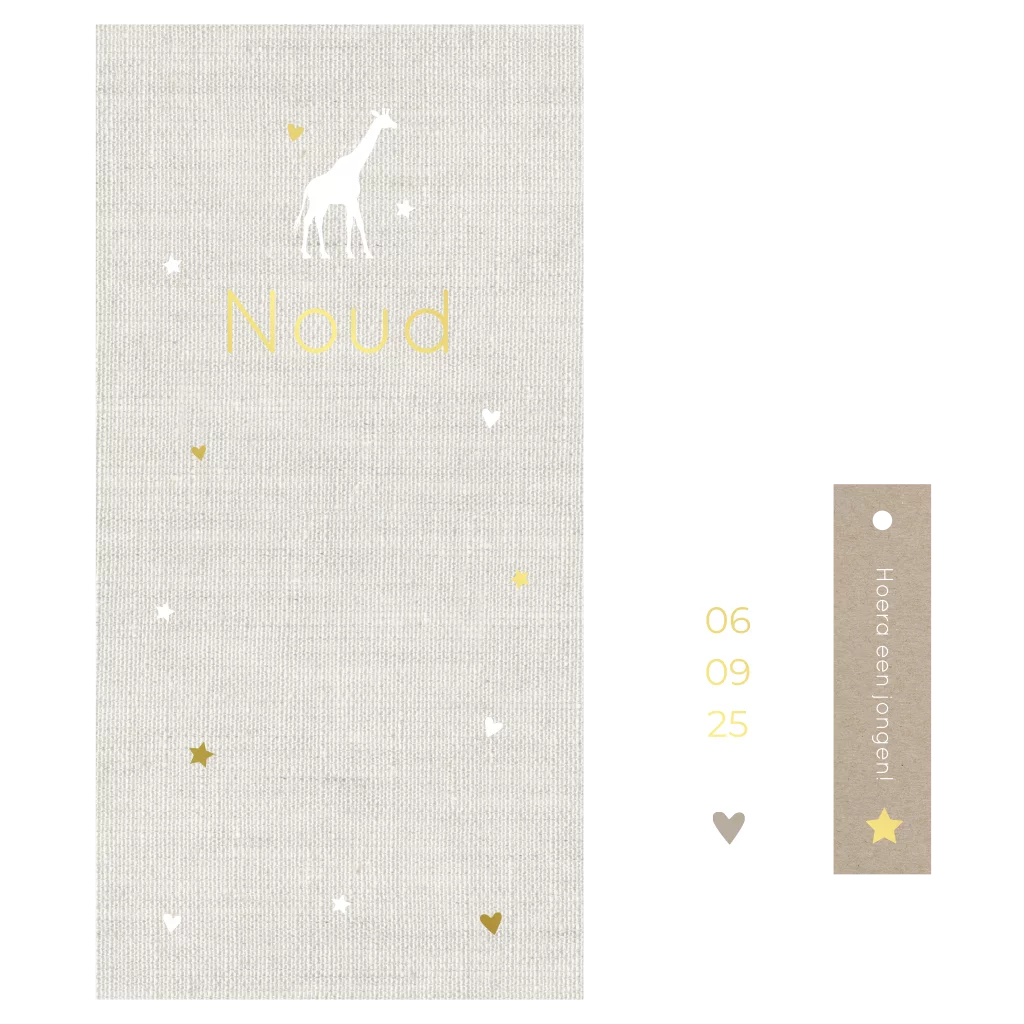 Op zoek naar een neutraal en origineel geboortekaartje? Dit lieve unisex kaartje heeft 2 kleine labeltjes die de kaart helemaal afmaken! Het geboortekaartje heeft een linnen look achtergrond met hartjes en goudfolie elementen. Pas de kleur van de kaart en de folie naar wens aan. De labels worden geleverd inclusief boorgaatje en deze kun je met een touwtje aan de kaart vastmaken. Het touw mag je nog los bestellen bij de kaart en kun je vinden op de pagina Extra's.