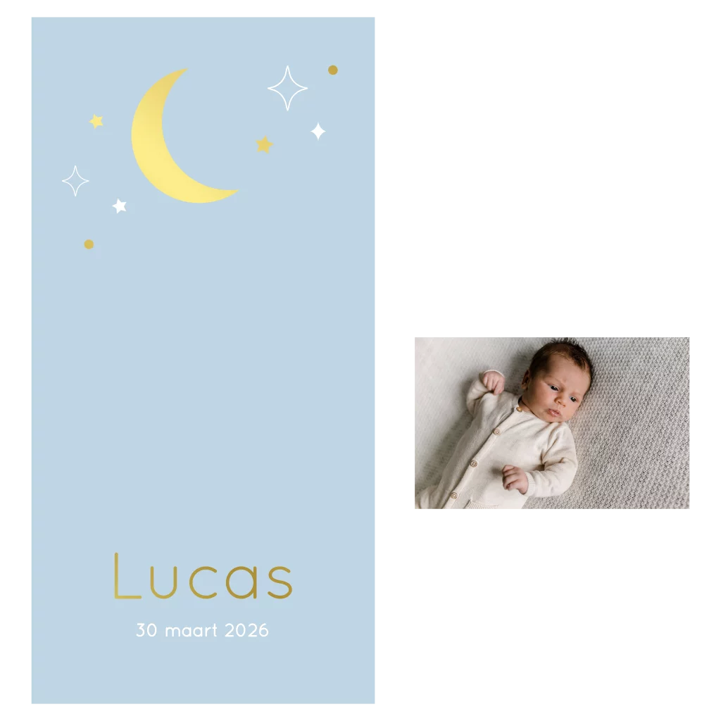Geboortekaartje labelkaart, fotokaart jongen blauw, maan sterren, goudfolie