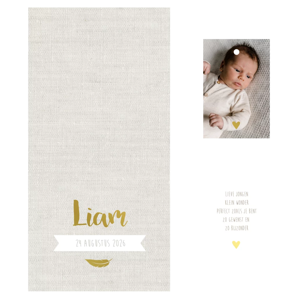 Een modern geboortekaartje met goudfolie en labels. De hoofdkaart heeft een linnen look achtergrond en een formaat van 20x10 cm. Op het kleinste kaartje kun je een foto en gedichtje toevoegen. Het geboortekaartje is afgewerkt met goudfolie en je kunt de kleuren zelf naar wens aanpassen. Er zitten al gaatjes in de kaartjes. Je maakt de 3 kaartjes aan elkaar vast met een touwtje of een lintje. Deze mag je nog los bestellen bij de kaarten en kun je vinden via de pagina met extra producten. Fotografie: Anouk Wubs - www.anoukwubs.nl