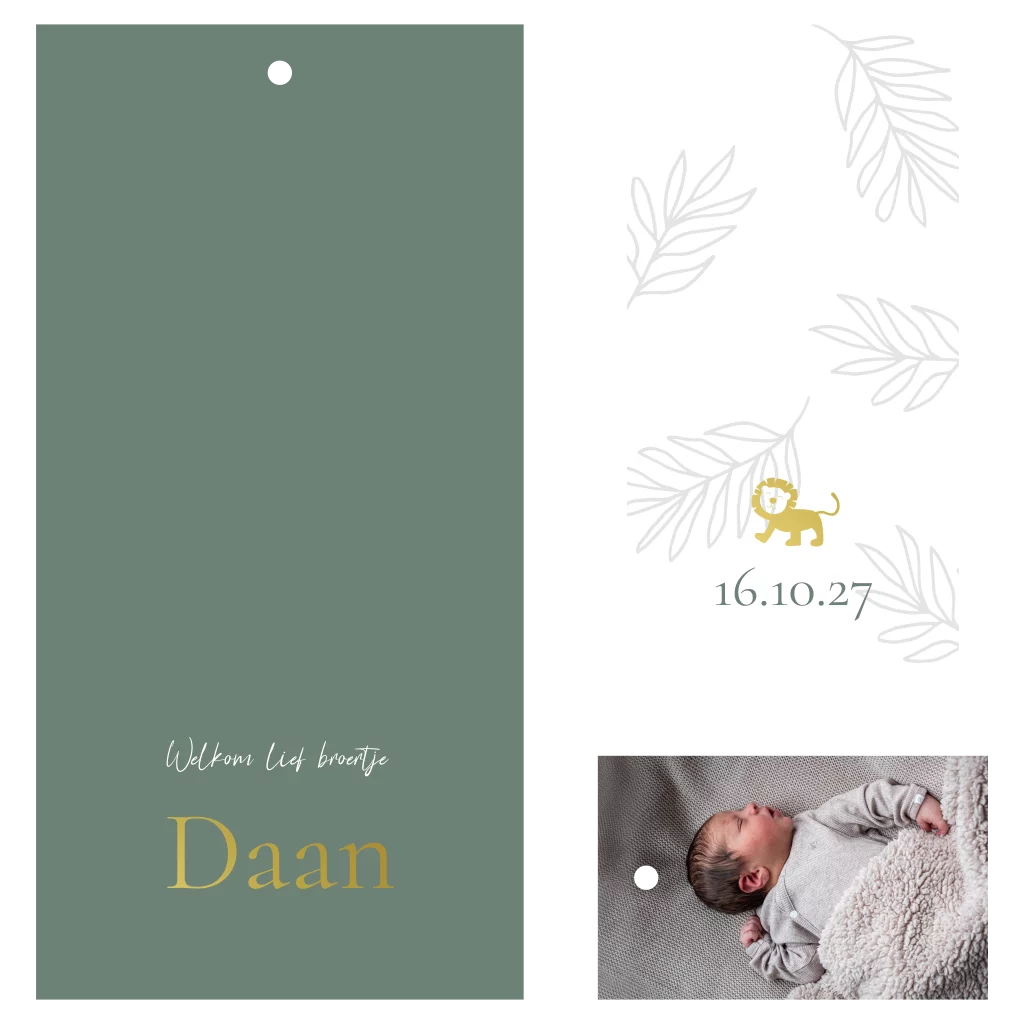 Een uniek stapel geboortekaartje voor jullie kindje. Dit bijzondere kaartje bestaat uit meerdere kaartjes, elk in een verschillende vorm en grootte, waarbij de hoofdkaart een groene achtergrond van 20x10 cm heeft. Maak het persoonlijk door een foto van je kleintje op het kleinste kaartje te plaatsen. Het kaartje is aan de voorzijde afgewerkt met glimmende goudfolie. In de editor pas je naar wens zelf de kleuren en lettertype aan.