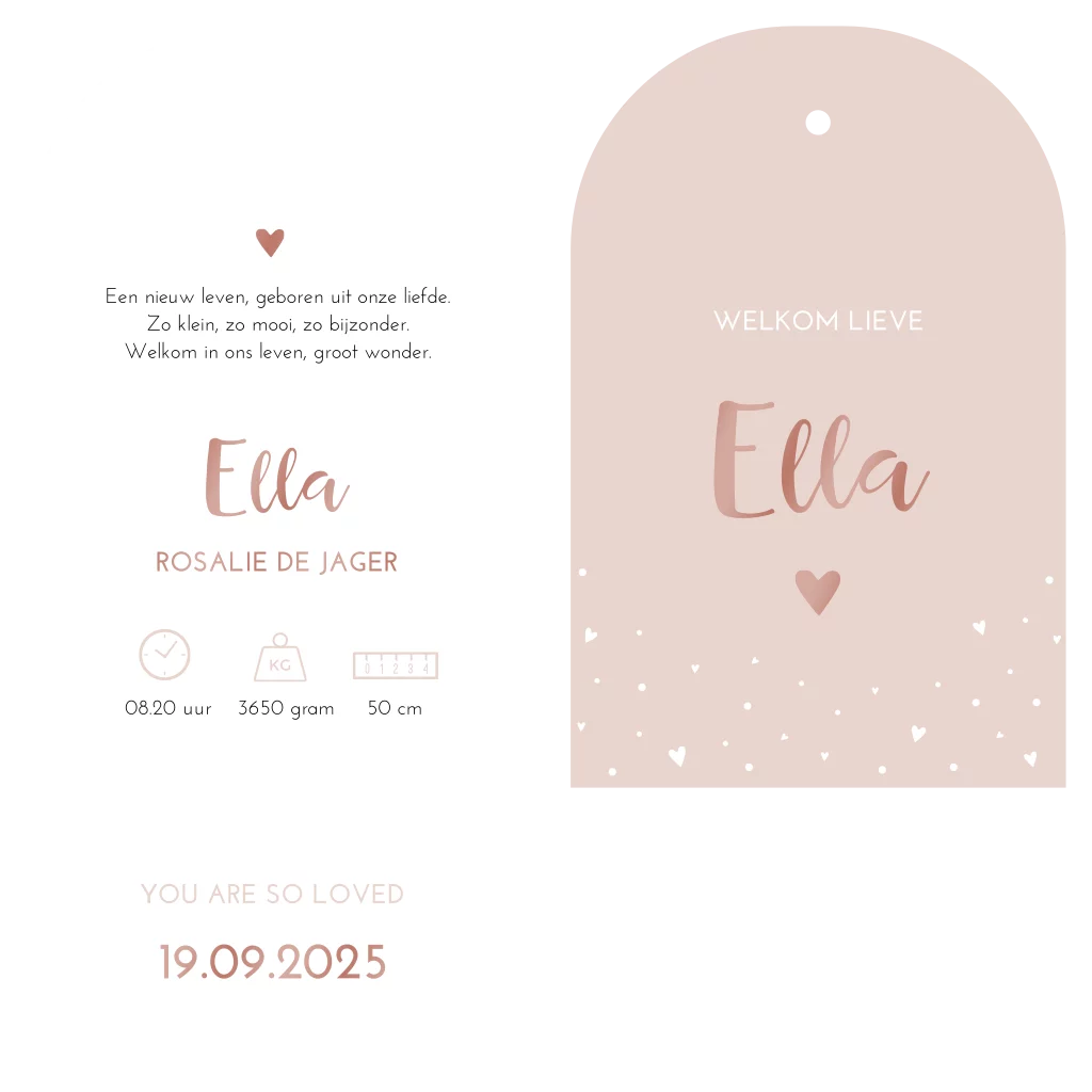 Een origineel stapel geboortekaartje die bestaat uit 2 labels met een boogvorm. Het achterste label heeft een witte achtergrond kleur en een formaat van 20x10 cm. Het voorste label heeft een oudroze kleur met hartjes. Het geboortekaartje is afgewerkt met hoogglans lak en je kunt de kleuren zelf naar wens aanpassen. Er zitten al gaatjes in de labels. Je maakt de 2 labels aan elkaar vast met een splitpen of touwtje. Deze mag je nog los bestellen bij de kaarten en kun je vinden via de pagina met extra producten.