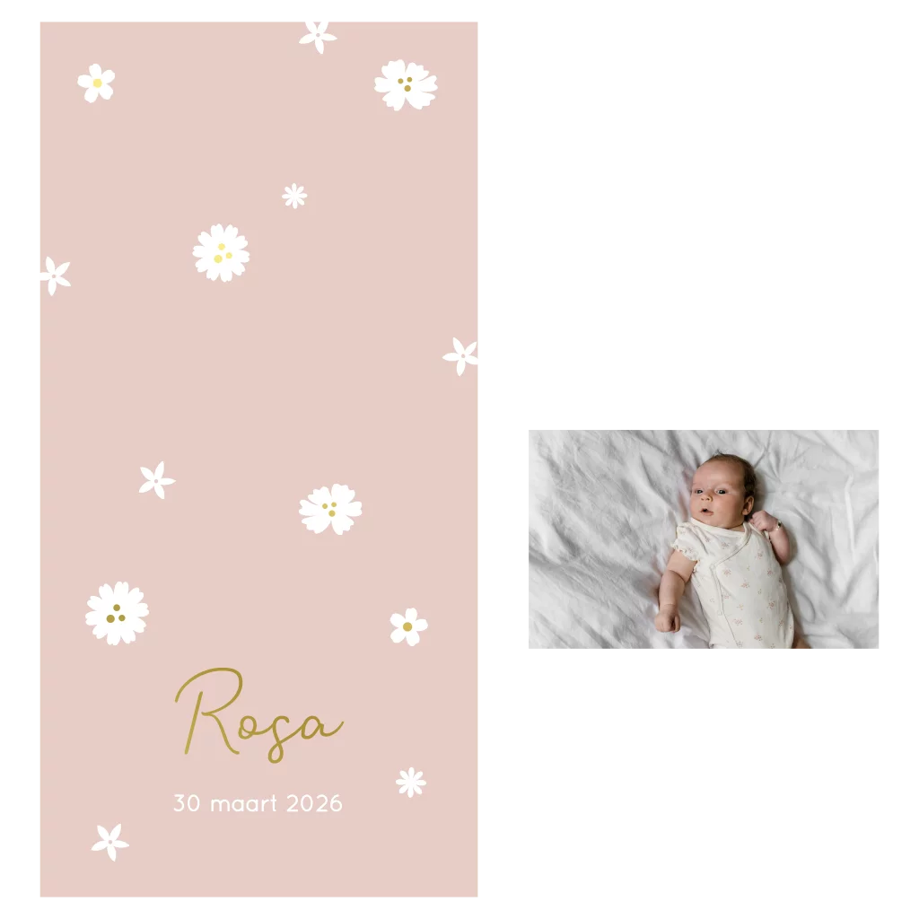 Een lief geboortekaartje voor een meisje met bloemen, goudfolie en een fotokaartje. De hoofdkaart heeft een roze achtergrond en een formaat van 20x10 cm. Op het kleinste kaartje kun je een foto van jullie kindje toevoegen. Het geboortekaartje is afgewerkt met goudfolie en je kunt de kleuren zelf naar wens aanpassen. Het fotokaartje kun je met een paperclip aan de grote kaart vastmaken. Deze mag je nog los bestellen bij de kaarten en kun je vinden via de pagina met extra producten. Fotografie: Anouk Wubs - www.anoukwubs.nl
