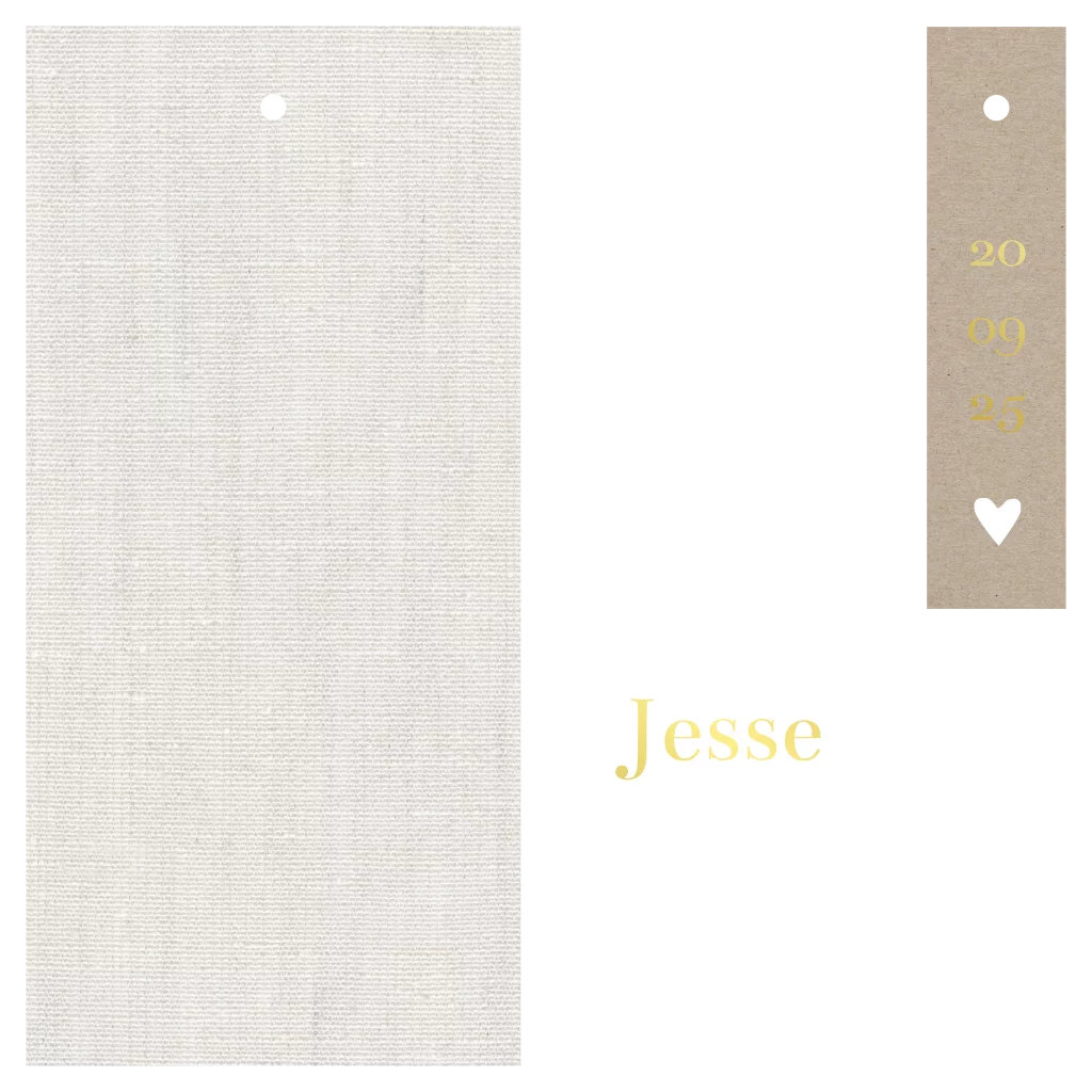Een neutraal en origineel stapel geboortekaartje die bestaat uit meerdere kaartjes in verschillende vormen. De hoofdkaart heeft een linnen look achtergrond en een formaat van 20x10 cm. Het geboortekaartje is afgewerkt met goudfolie en er zitten al gaatjes in de kaartjes. Je maakt de 3 kaartjes aan elkaar vast met een splitpen. Deze mag je nog los bestellen bij de kaarten en kun je vinden via de pagina met extra producten.
