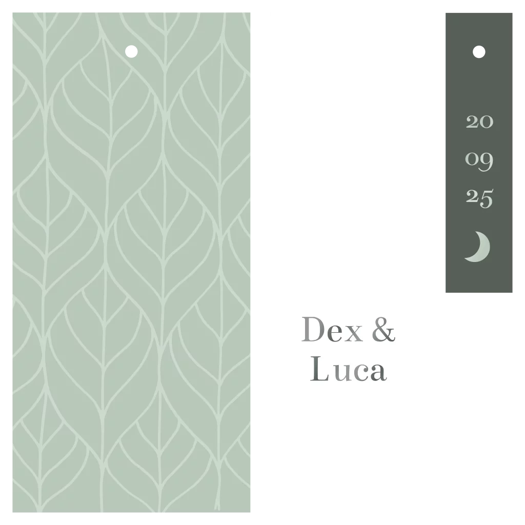 Een modern geboortekaartje voor een jongens tweeling! Dit geboortekaartje bestaat uit 3 labels in verschillende vormen. Het kaartje heeft groene tinten en is afgewerkt met hoogglans lak aan de voorzijde. De kleuren en lettertypes kun je nog helemaal naar wens aanpassen.