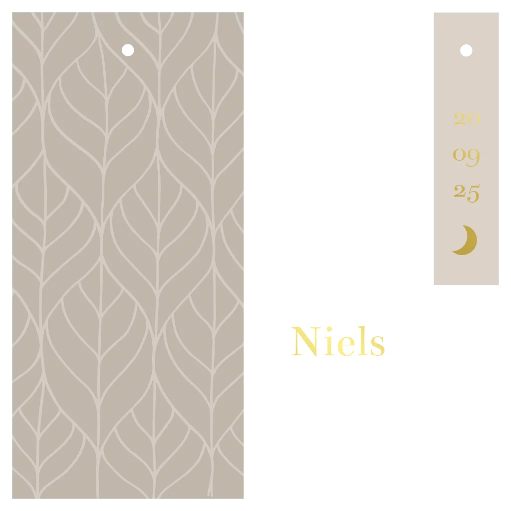 Een neutraal en origineel stapel geboortekaartje die bestaat uit meerdere kaartjes in verschillende vormen. De hoofdkaart heeft een beige kleur achtergrond met botanische bladeren en een formaat van 20x10 cm. Het geboortekaartje is afgewerkt met goudfolie en er zitten al gaatjes in de kaartjes. Je maakt de 3 kaartjes aan elkaar vast met een splitpen. Deze mag je nog los bestellen bij de kaarten en kun je vinden via de pagina met extra producten.