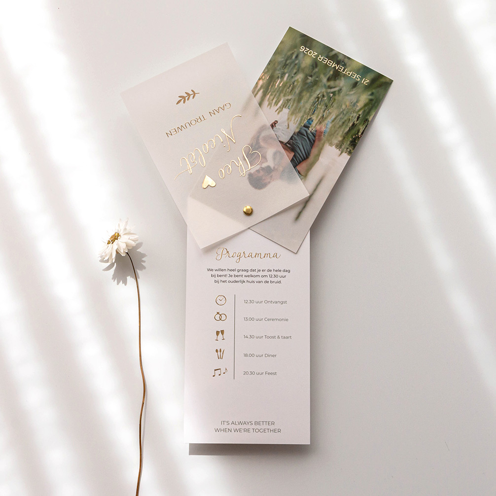 Trouwkaart labelkaart stapelkaart met foto en goudfolie