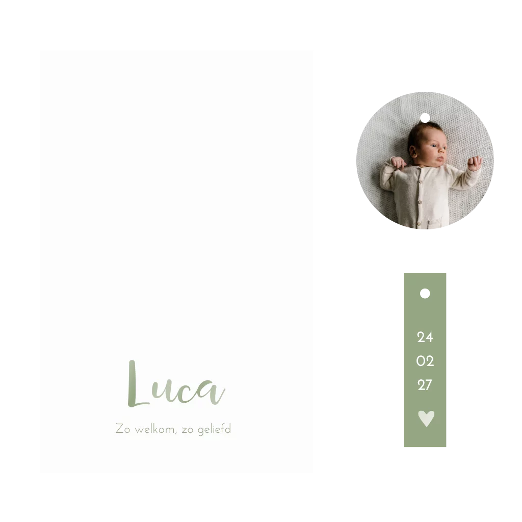Een uniek geboortekaartje met 2 labeltjes en hoogglans lak. Op het labeltje in de vorm van een cirkel kun je een foto plaatsen van jullie kindje. Maak de beide labels met een mooi touw of lintje aan de geboortekaart vast. Pas de kleuren van de kaart nog naar wens aan.