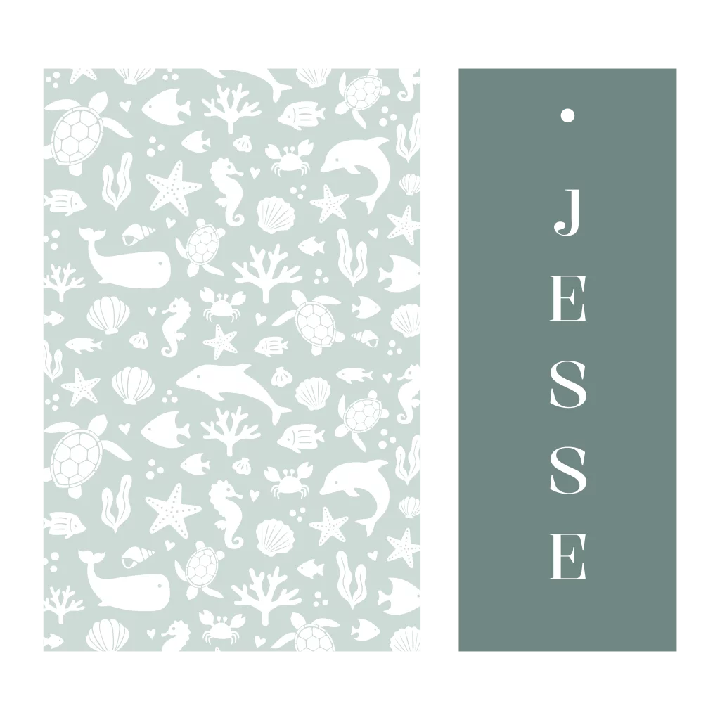 Uniek label geboortekaartje met oceaan thema. Dit geboortekaartje bestaat uit 2 labels die je aan elkaar vast kunt maken met een splitpen of een mooi lintje. Het grootste kaartje heeft een patroon met oceaan thema. Pas de kleuren van de kaart nog naar wens aan.
