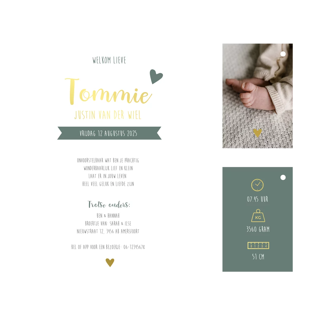 Geboortekaartje en labelkaart jongen, groen & goudfolie