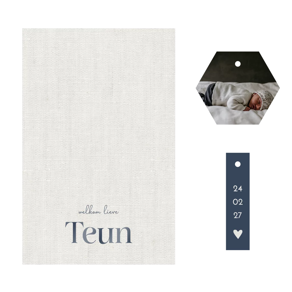 Een uniek geboortekaartje met 2 labeltjes en goudfolie. Het kaartje heeft een linnen look achtergrond met donkerblauwe elementen. Op het labeltje in de vorm van een zeshoek kun je een foto plaatsen van jullie kindje. Maak de beide labels met een mooi touw of lintje aan de geboortekaart vast. Pas de kleuren van de kaart nog naar wens aan.