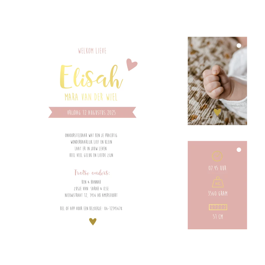 Een origineel geboortekaartje dat bestaat uit meerdere kaartjes in verschillende formaten. De hoofdkaart heeft ronde hoeken en een formaat van 17x11,5 cm. Op de twee kleine kaartjes is er plaats voor een foto, gedichtje en extra informatie en deze zijn al voorzien van een gaatje. De kaart heeft een roze kleur met goudfolie, maar je kunt de kleuren van de kaart zelf naar wens aanpassen. Je maakt de kaartjes aan elkaar vast met een mooi touwtje of lint. Deze mag je nog los bestellen bij de kaarten en kun je vinden via de pagina met extra producten. Fotografie: Anouk Wubs - www.anoukwubs.nl