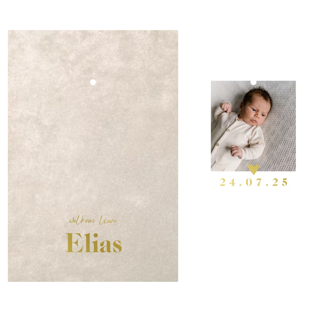 Neutraal geboortekaartje in een origineel formaat! Dit geboortekaartje bestaat uit een grote kaart met beige velvet look achtergrond en een kleine losse polaroid foto. De hoofdkaart heeft een formaat van 17x11,5 cm. Op de polaroid foto kun je een foto van jullie kindje toevoegen. Het geboortekaartje is afgewerkt met goudfolie en je maakt de kaartjes aan elkaar vast met een splitpen. Deze mag je nog los bestellen bij de kaarten en kun je vinden via de pagina met extra producten. Fotografie: Anouk Wubs - www.anoukwubs.nl