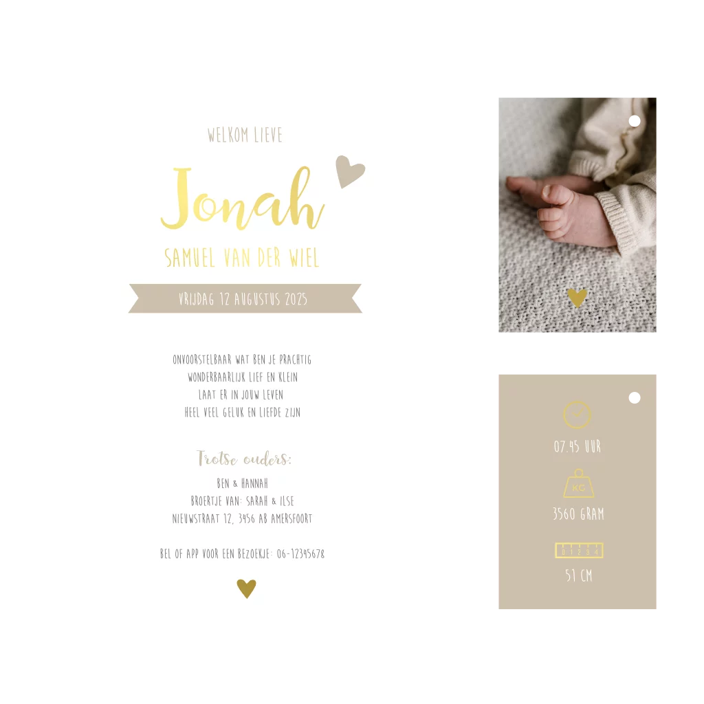 Een neutraal en origineel geboortekaartje voor een jongen of meisje met een fotokaartje en goudfolie. De kaart bestaat uit meerdere kaartjes in verschillende formaten. De hoofdkaart heeft ronde hoeken en een formaat van 17x11,5 cm. Op de twee kleine kaartjes is er plaats voor een foto, gedichtje en extra informatie en deze zijn al voorzien van een gaatje. Je maakt de kaartjes aan elkaar vast met een mooi touwtje of lint. Deze mag je nog los bestellen bij de kaarten en kun je vinden via de pagina met extra producten. Fotografie: Anouk Wubs - www.anoukwubs.nl