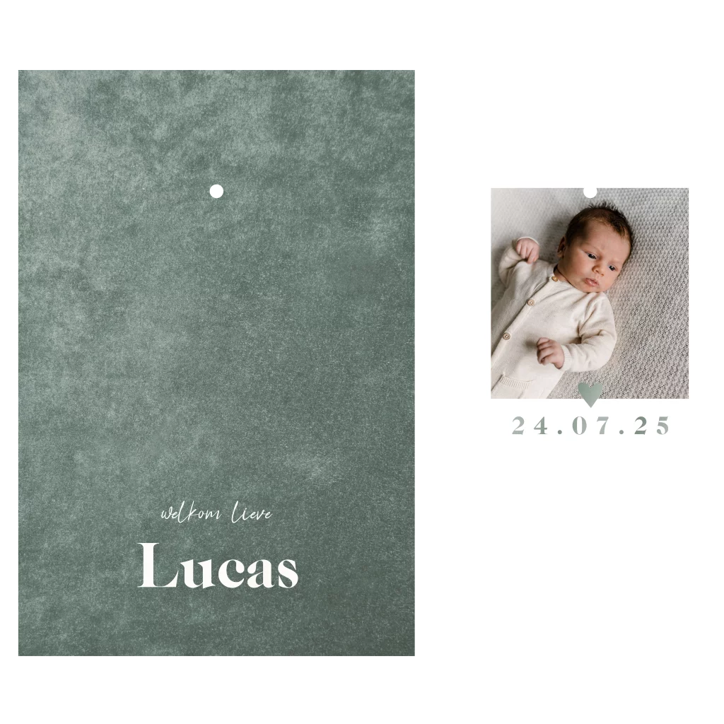 Een origineel geboortekaartje die bestaat uit een grote kaart en een losse polaroid foto. De hoofdkaart heeft een groene velvet look achtergrond en een formaat van 17x11,5 cm. Op de polaroid foto kun je een foto van jullie kindje toevoegen. Het geboortekaartje is afgewerkt met hoogglans lak en je kunt de kleuren zelf naar wens aanpassen. Je maakt de kaartjes aan elkaar vast met een splitpen. De grote kaart en de polaroid zijn al voorzien van een gaatje. Deze mag je nog los bestellen bij de kaarten en kun je vinden via de pagina met extra producten. Fotografie: Anouk Wubs - www.anoukwubs.nl