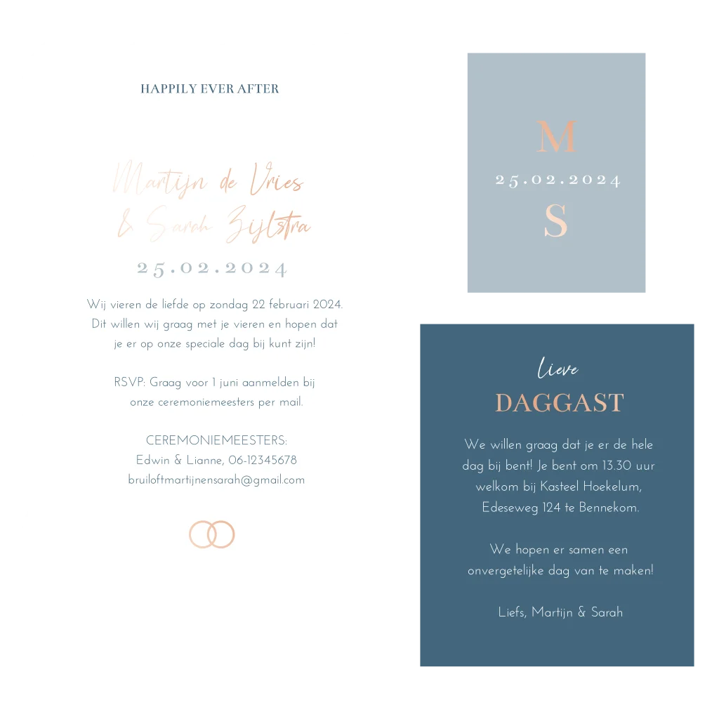 Een moderne trouwkaart volgens de laatste trends? Deze unieke trouwkaart bestaat uit meerdere kaartjes in verschillende vormen. De hoofdkaart heeft een golfvorm en een formaat van 16,5x11 cm. De trouwkaart heeft de kleuren blauw, wit en rosefolie. Je kunt de kleuren zelf nog naar wens aanpassen. Je maakt de 3 kaartjes aan elkaar vast met een mooie paperclip. Deze mag je nog los bestellen bij de kaarten en kun je vinden via de pagina met extra producten.