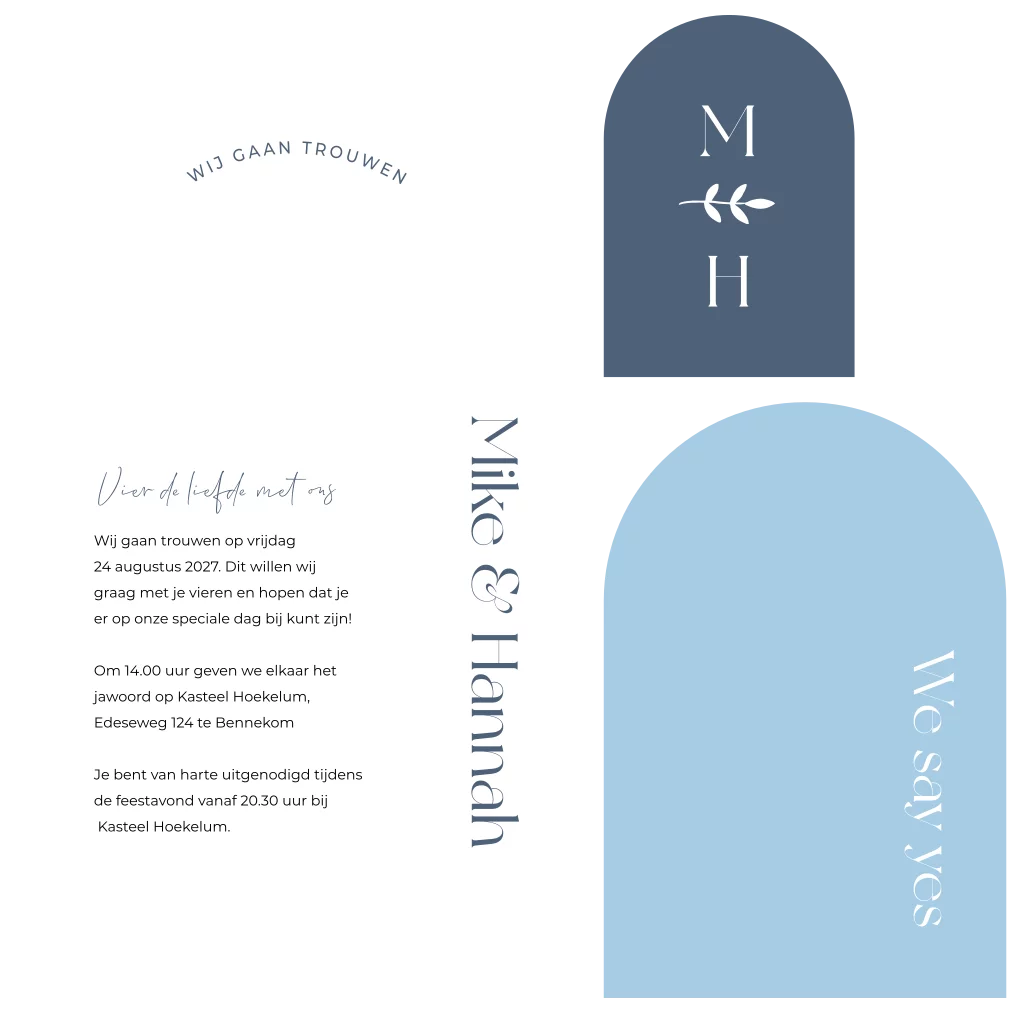 Een originele stapel trouwkaart die bestaat uit meerdere kaartjes in verschillende vormen. De hoofdkaart heeft een boogvorm en een formaat van 17x11 cm. De trouwkaart heeft blauwe tinten en je kunt de kleuren zelf naar wens aanpassen. Je maakt de 3 kaartjes aan elkaar vast met een mooie paperclip. Deze mag je nog los bestellen bij de kaarten en kun je vinden via de pagina met extra producten.