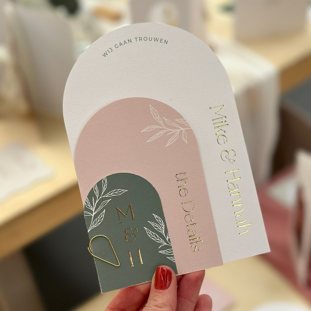 Een originele stapel trouwkaart die bestaat uit meerdere boogvorm kaartjes met roze en groene tinten. De hoofdkaart heeft een formaat van 17x11 cm. De trouwkaart is afgewerkt met goudfolie en je kunt de kleuren zelf naar wens aanpassen. Je maakt de 3 kaartjes aan elkaar vast met een mooie paperclip. Deze mag je nog los bestellen bij de kaarten en kun je vinden via de pagina met extra producten.