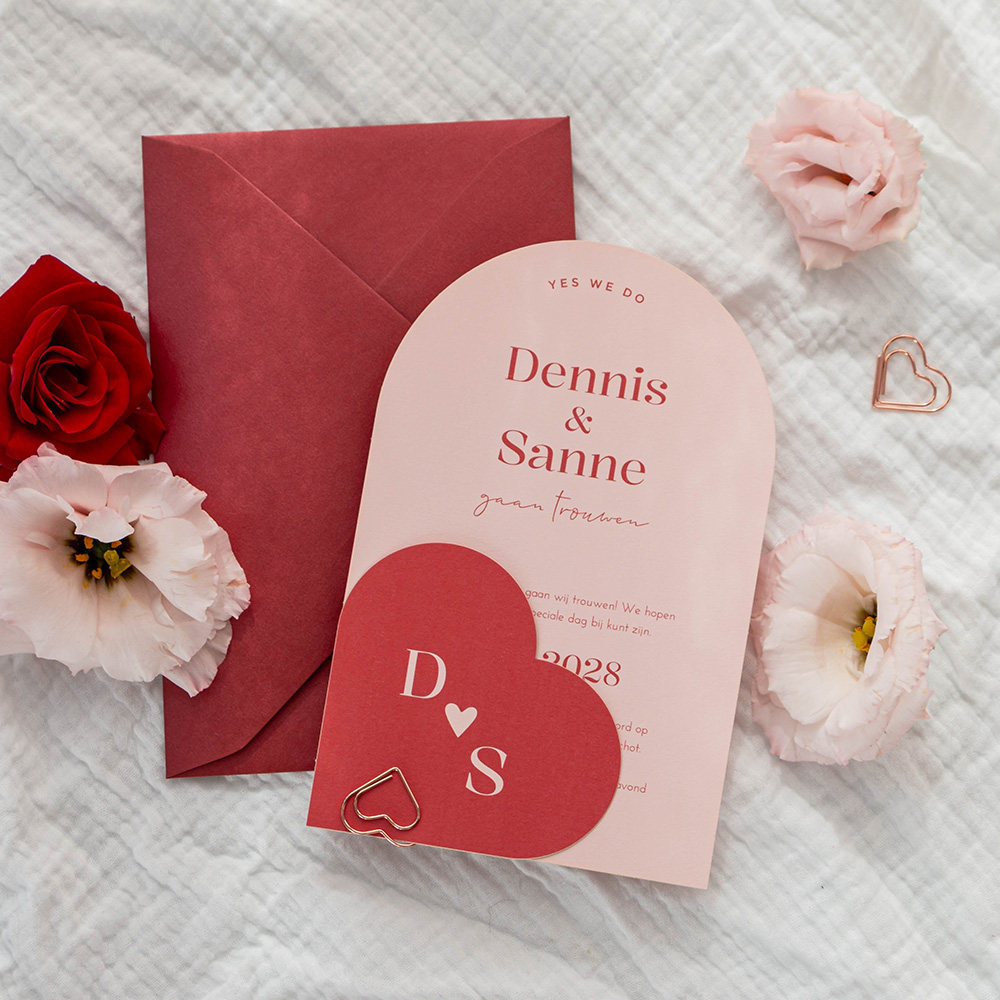Een unieke trouwkaart die bestaat uit 2 delen: een roze boogvorm kaart met een hartje in een rode kleur met trouwlogo. Je maakt de beide delen aan elkaar vast met een mooie paperclip. Zo verstuur je de liefde naar al jullie gasten! Pas de kleuren van de uitnodiging nog naar wens aan. Sfeerfotografie: Isa van den Belt Fotografie