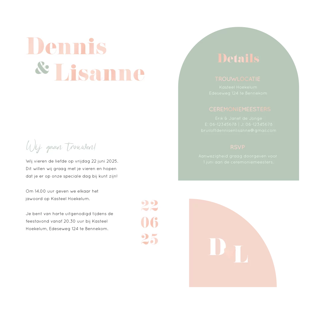 Trouwkaart labelkaart boogvorm modern pakketje peach mint kleur
