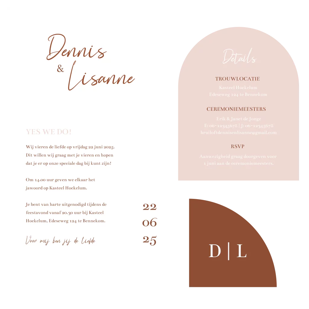 Moderne en originele trouwkaart die bestaat uit meerdere kaartjes in verschillende vormen. De hoofdkaart heeft een formaat van 17x11 cm en de boogvorm kaartjes hebben een lichtroze en roest rode kleur. Je kunt de kleuren zelf nog naar wens aanpassen. Je maakt de 3 kaartjes aan elkaar vast met een mooie paperclip. Deze mag je nog los bestellen bij de kaarten en kun je vinden via de pagina met extra producten.