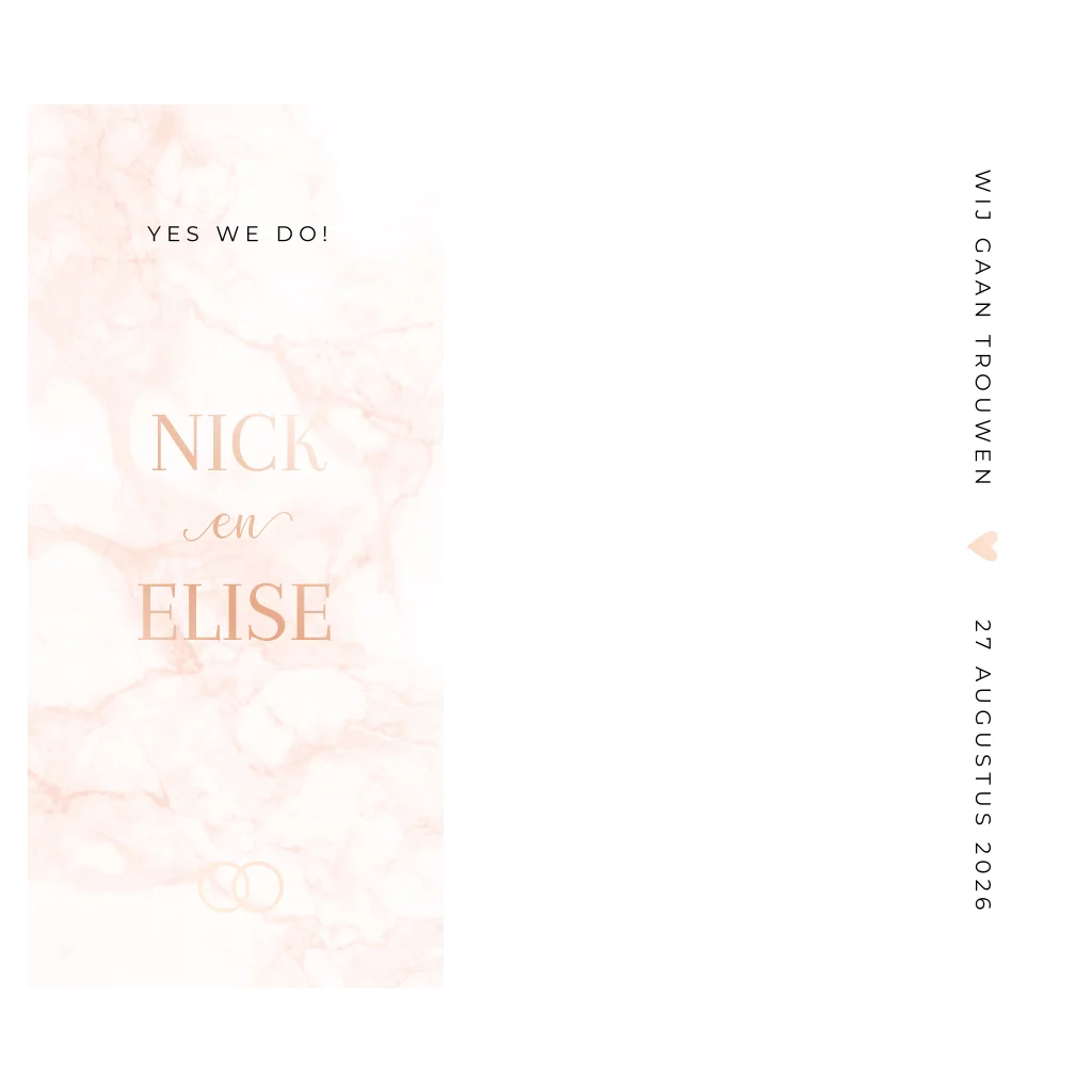 Verstuur een unieke trouwkaart om jullie gasten uit te nodigen voor jullie bruiloft! Deze trouwkaart met marmer look en rosefolie bestaat uit 2 labels: een voorkant met jullie namen en programma en een achterkaart met een golvende vorm. Je kunt de kleuren en lettertypes nog helemaal naar wens aanpassen. Formaat: voorste label 80x170mm, achterste label: 110x170mm.