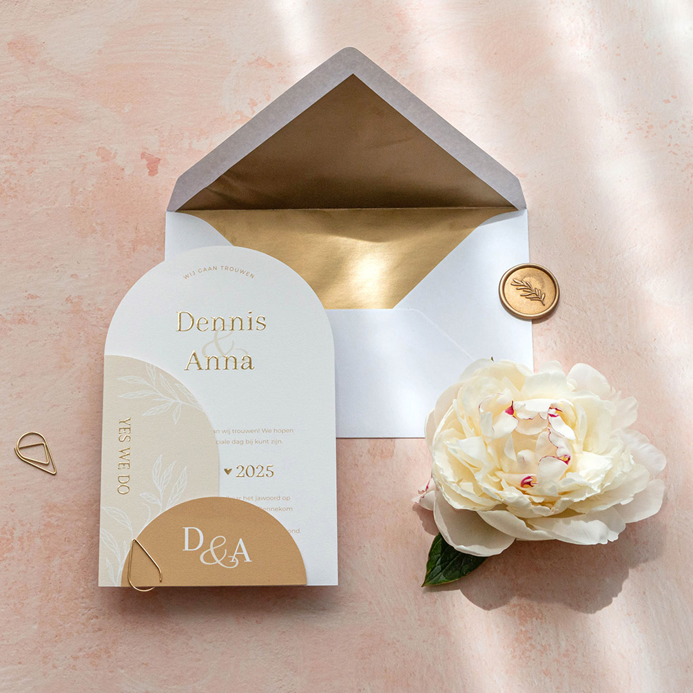 Trouw- & labelkaart pakket boogvorm crème, goudfolie & takjes