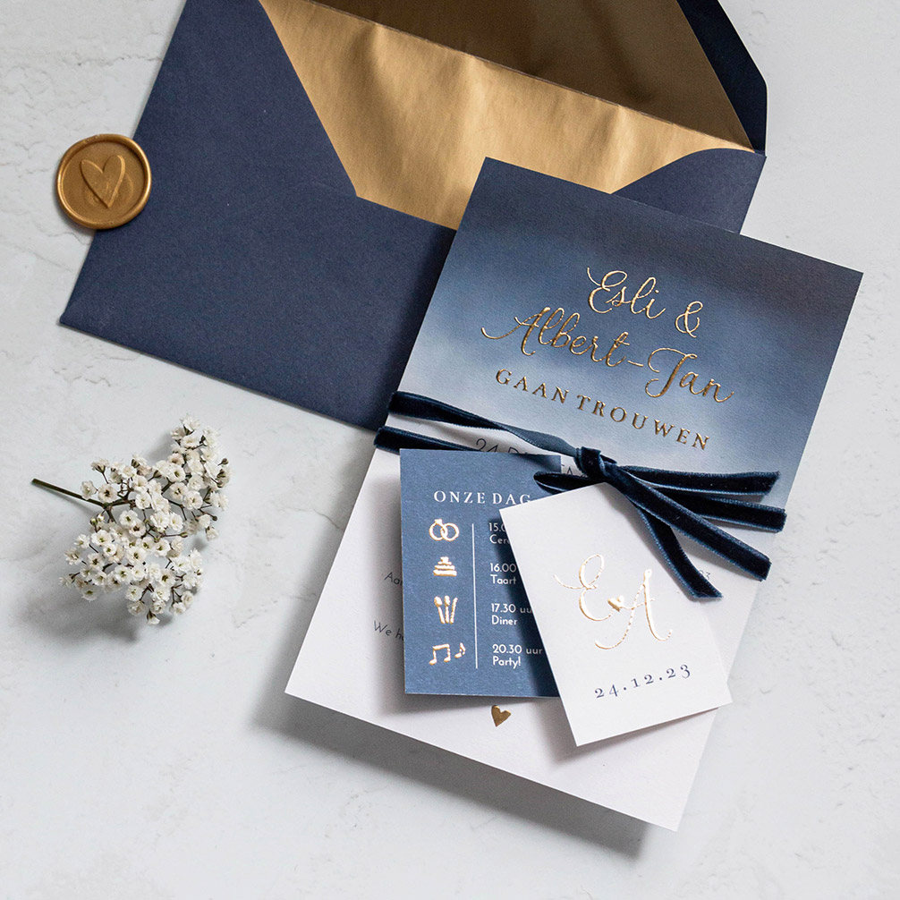 Deze trouwkaart met goudfolie en labels bestaat uit meerdere kaartjes in verschillende formaten. De hoofdkaart heeft een donkerblauwe watercolor achtergrond en een formaat van 17x11,5 cm. Op de twee kleine kaartjes is er plaats voor een trouwlogo met jullie initialen, extra informatie en deze zijn al voorzien van een gaatje. Je maakt de kaartjes aan elkaar vast met een mooi touwtje of lint. Deze mag je nog los bestellen bij de kaarten en vind je via de pagina met extra producten.