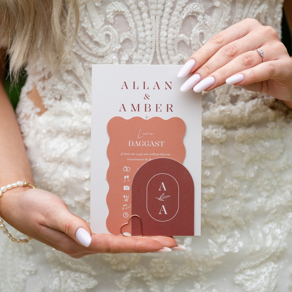 Trouwen jullie in de herfst? Deze originele trouwkaart die bestaat uit meerdere kaartjes in verschillende vormen past perfect bij een herfstbruiloft! De hoofdkaart heeft een beige achtergrond en een formaat van 17x11 cm. Je maakt de 3 kaartjes aan elkaar vast met een mooie paperclip. Deze mag je nog los bestellen bij de kaarten en kun je vinden via de pagina met extra producten.