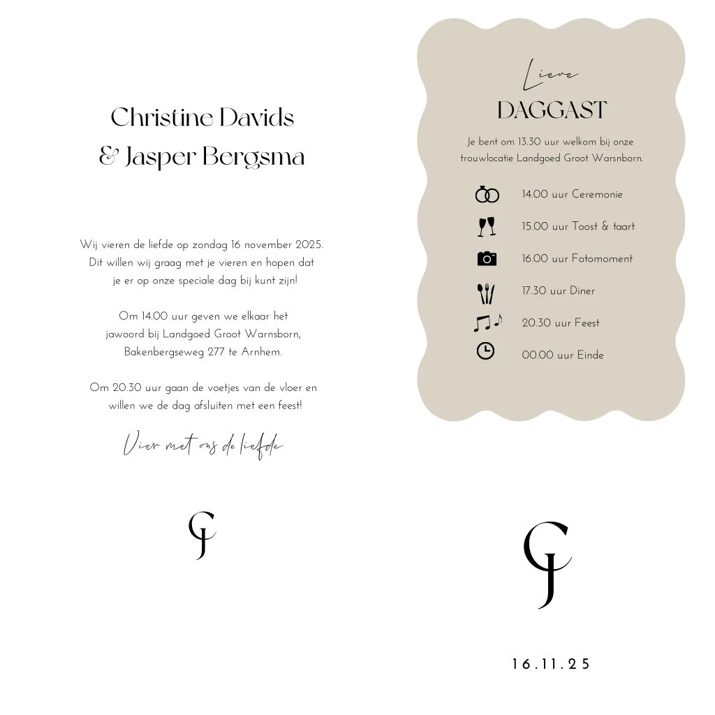 Moderne en chique stapel trouwkaart in witte en beige tinten. De trouwkaart bestaat uit meerdere kaartjes met verschillende vormen zoals een golf en boogvorm. Pas de trouwkaart nog naar wens aan in de stijl en kleuren van jullie bruiloft.