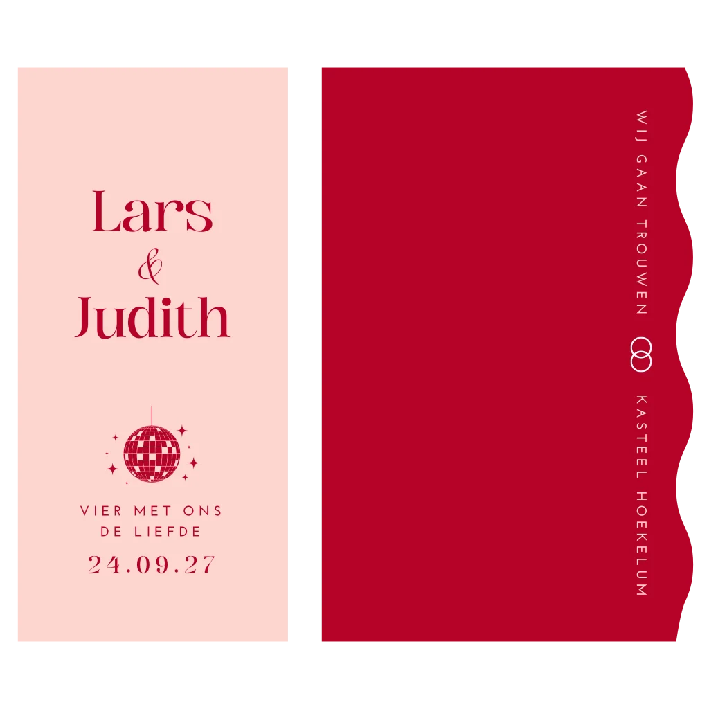 Yes, jullie gaan trouwen: tijd voor een feestje! Deze moderne trouwkaart met discobal bestaat uit 2 labels: een voorkant met jullie namen en programma en een achterkaart met een golvende vorm in een roze met roze kleur. Formaat: voorste label 80x170mm, achterste label: 110x170mm.