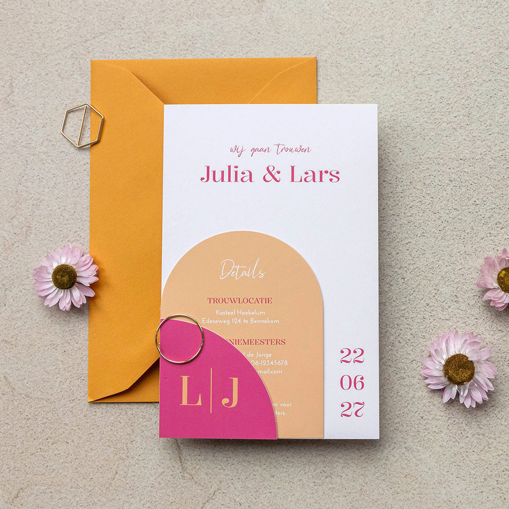 Trouwkaart stapelkaart modern geel roze